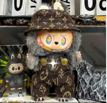 Dress up your Labubu figure with this adorable LV-inspired toy outfit featuring overalls and bucket hat. Perfect for adding a playful and stylish twist to your collection, this set brings charm and personality to your favorite monster. A fun way to keep your Labubu looking fresh and fashionable!
