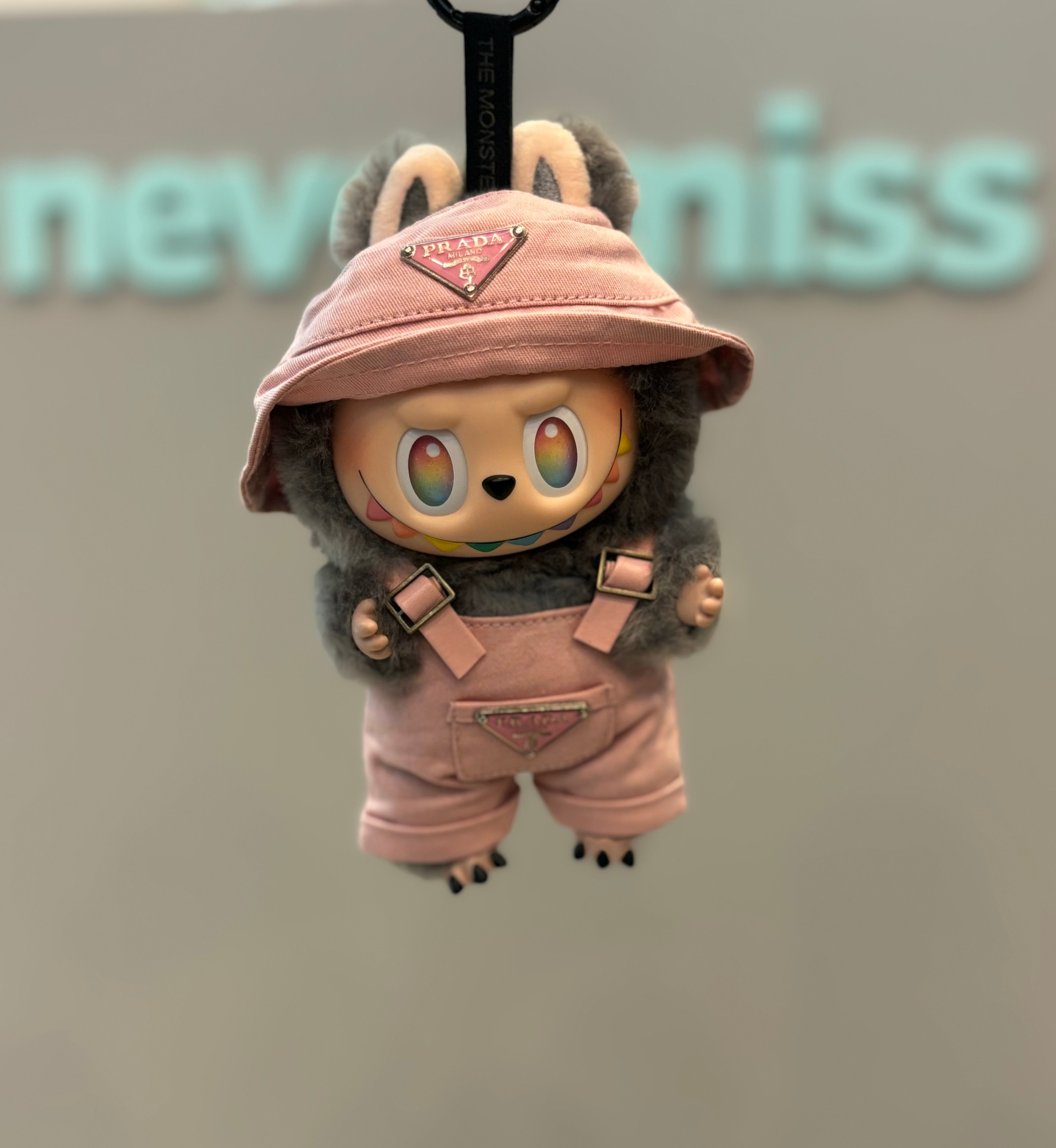 Dress up your Labubu figure with this adorable pink Prada-inspired toy outfit featuring overalls and a bucket hat. Perfect for adding a playful and stylish twist to your collection, this set brings charm and personality to your favorite monster. A fun way to keep your Labubu looking fresh and fashionable!